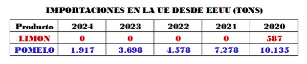La buena noticia es que la reducción o eliminación de aranceles por parte de la UE a las importaciones de limón y pomelo en la UE, a efectos prácticos, no va a afectar y no se espera un incremento de volúmenes de EE. UU. en la UE. Su producción está dirigida a abastecer su mercado interno que es deficitario en el caso de limón, y la producción de pomelo en Florida se ha visto muy reducida en los últimos años como consecuencia de los problemas fitosanitarios.
