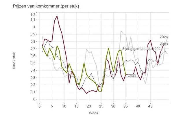 Al final de la semana 35, el precio medio de los tomates en rama seguía apenas por encima de 1 euro en las subastas de la Federación de Cooperativas Hortícolas Belgas. Los tomates sueltos alcanzaron una media de 88 céntimos de euro. Todavía por encima de la media y precios iguales a los del año pasado, después de haber alcanzado brevemente su punto máximo.