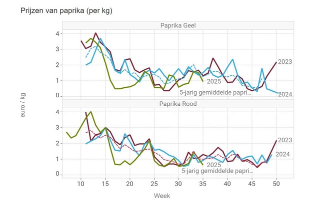 Los precios medios de los pimientos rojos y amarillos también están por debajo de la media quinquenal. Hubo un breve repunte del precio. Incluso los precios bajos de mediados de verano estaban ya por debajo de la media quinquenal. Los pimientos verdes obtuvieron el mejor precio medio en la semana 35, con un precio por kilogramo superior a 1,18 euros.