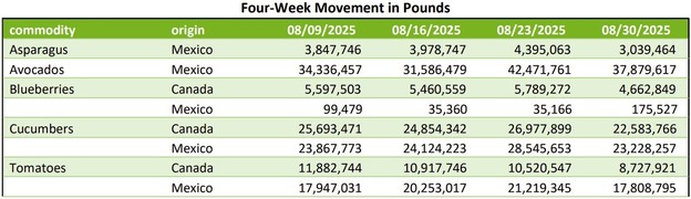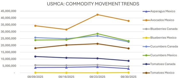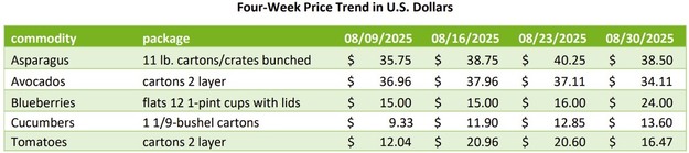 Los mercados de espárrago, aguacate, arándano, pepino y tomate en Estados Unidos presentaron una semana de actividad desigual en la semana 35, influida en gran medida por variaciones estacionales y movimientos de precios que afectaron el ritmo de comercialización.