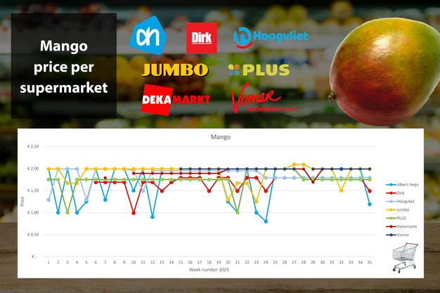 Los precios del mango han vuelto a niveles normales en Albert Heijn y Dirk, por lo que el precio medio repunta de 1,80 a 1,91 euros.