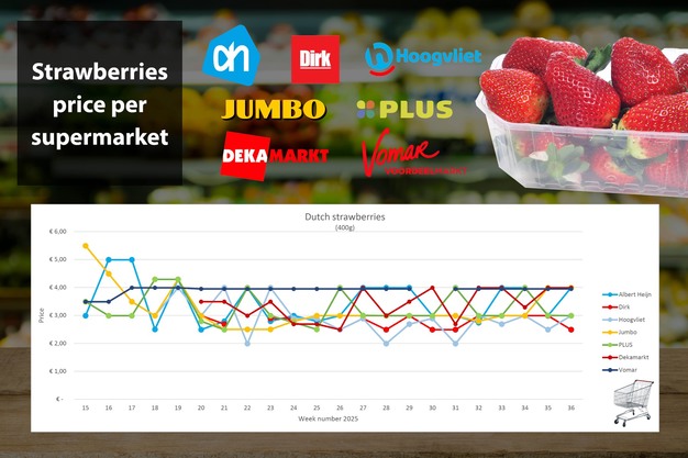 Dirk tiene las fresas de oferta con una rebaja de 50 céntimos, sin embargo, las promociones de Albert Heijn y Hoogvliet ya han acabado, por lo que el precio medio mantiene la tendencia al alza, situándose en 3,54 euros por 400 gramos.