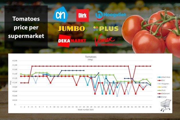 Muchas ofertas con los tomates en rama, tanto en Albert Heijn como en Plus (ambas han rebajado el precio 20 céntimos), así como en Vomar (-10 céntimos). Esto ha provocado una caída notable del precio medio, que ha pasado de 1,24 euros en la semana 35 a 1,15 euros en la 36.