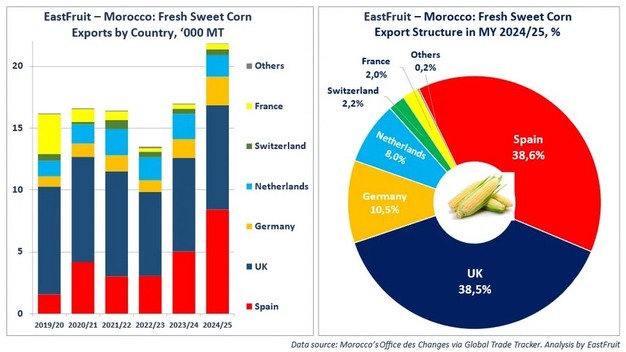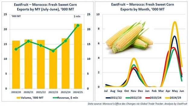 En la campaña 2024/25, Marruecos exportó 21.800 toneladas de maíz dulce fresco, que generaron más de 20 millones de dólares en ingresos, según EastFruit con datos de Global Trade Tracker a través de la Oficina de Cambios de Marruecos. Esto representa un aumento del 28% en comparación con la campaña 2023/24 y del 61% con respecto a la de 2022/23. Es la primera vez que las exportaciones superan las 20.000 toneladas en una sola campaña.