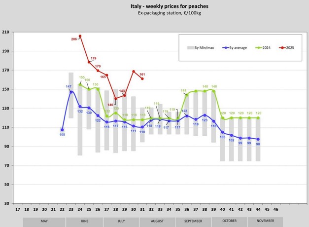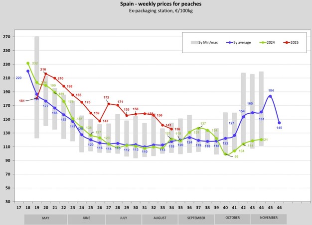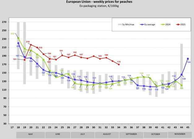 En el conjunto de la Unión Europea, los precios medios del melocotón bajaron de 186 euros/100 kg en la semana 32 a 178 euros en la 33, y de nuevo a 170 euros en la 34. Se trata de un descenso constante durante tres semanas consecutivas, que pone de manifiesto el impacto estacional de la oferta.