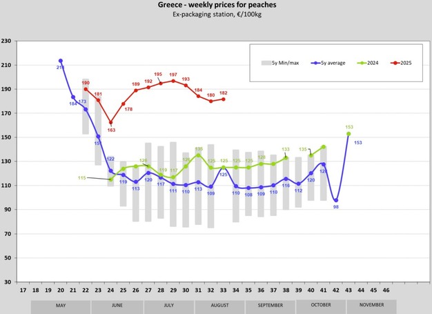 Los precios de los melocotones en la Unión Europea continuaron su tendencia a la baja durante el mes de agosto, y las últimas cifras de las semanas 32 a 34 muestran una mayor presión en la mayoría de los principales países productores. Los datos de España, Grecia y la media general de la UE ponen de relieve la suavización de los precios, mientras que Italia no ha comunicado cifras actualizadas para este periodo.
