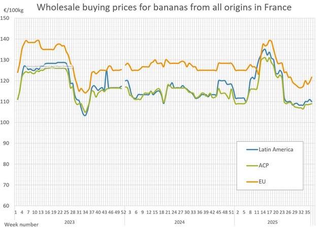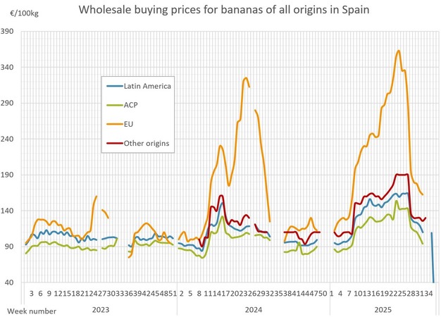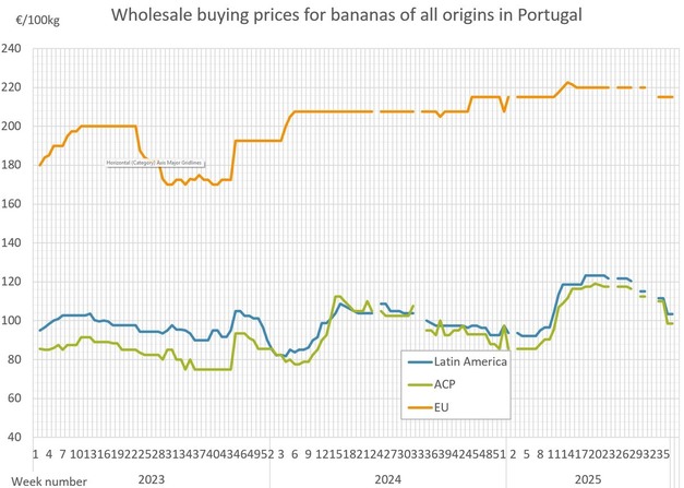 Polonia también experimentó un descenso de los precios. Las bananas bajaron de 107 euros en la semana 35 a 100 euros en la 36. En Portugal, en cambio, los precios al por mayor se mantuvieron estables, en 103 euros en las dos semanas de referencia, sin mostrar volatilidad a corto plazo.