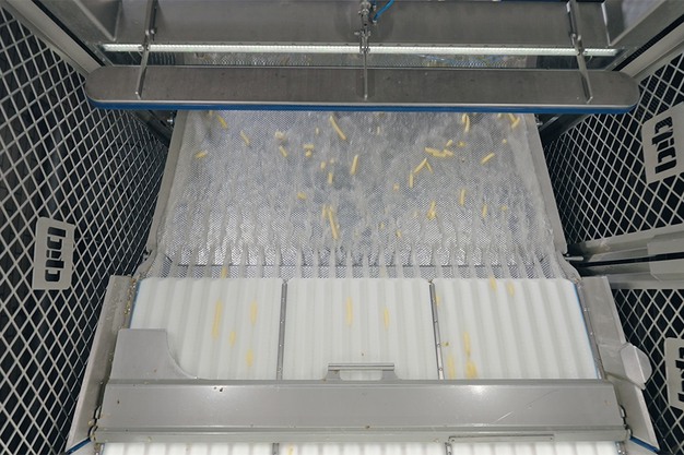 La S-Blade se coloca a continuación de una clasificadora óptica. Esta detecta y elimina las patatas ya cortadas que presentan manchas negras, que, a diferencia de los copos, se utilizarían como pienso o se compostarían. Sin embargo, PIP vio una oportunidad: "Esas patatas fritas no son totalmente inservibles", explica Bart. "A menudo tienen un único punto negro que nuestra máquina, simplemente, elimina con un corte".