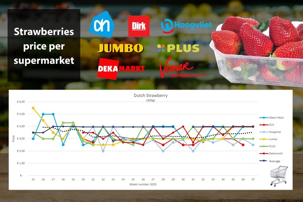 Tras la oferta de Dirk de la semana 36, Hoogvliet sigue su ejemplo y aplica la misma rebaja en la semana 37 (de 2,99 euros a 2,49 euros). Los demás supermercados mantienen sus precios estables. Dirk no ha ofrecido fresas en la semana 37. Como consecuencia, el precio medio ha subido unos 8 céntimos.