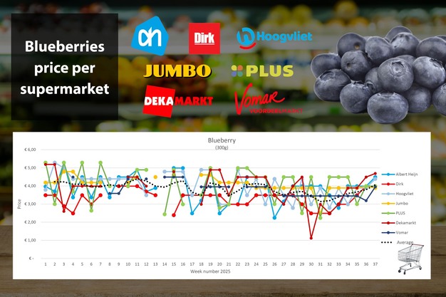 El precio medio semanal de los arándanos ha registrado un notable aumento (+27 céntimos) como consecuencia de las importantes subidas de precios de Vomar (+76 céntimos), Albert Heijn y Hoogvliet (ambos +50 céntimos) y DekaMarkt (+20 céntimos). Jumbo es la excepción, con una rebaja de 10 céntimos, con lo que su precio se sitúa en 3,89 euros por envase de 300 gramos.