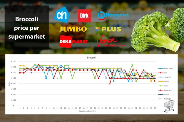© Supermarktscanner.nl El precio medio del brócoli ha vuelto a caer en la semana 37 tras rebajar el suyo DekaMarkt en nada menos que 26 céntimos, con lo que también ha pasado a tener el precio más bajo. Se acabó la oferta en PLUS y su precio se sitúa ahora en 1,09 euros, con lo que se coloca al mismo nivel que Albert Heijn, Hoogvliet y Jumbo.
