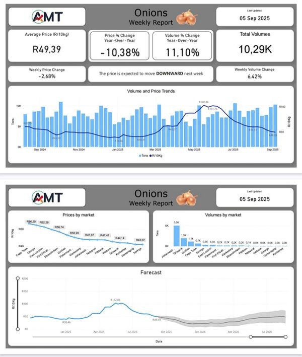 Limpopo suele suministrar cebollas de abril a octubre. En enero, las importantes precipitaciones retrasaron y concentraron las actividades de plantación, lo que provocó la entrada en el mercado de un gran volumen de cebollas durante julio y agosto. Este excedente superó la demanda y provocó que los precios medios cayeran por debajo de los 50 ZAR (2,40 euros) por un saco de 10 kg en el mercado mayorista (según AMT). Además, las horas de sol descendieron un 20% respecto al año pasado. La calidad y el rendimiento de las cebollas de la provincia son inferiores a los de la temporada anterior, lo que afecta a los beneficios de los productores. Las variedades de día corto allí cultivadas no pueden almacenarse y deben comercializarse en los mercados nacionales, lo que las hace más susceptibles a la volatilidad de los precios.