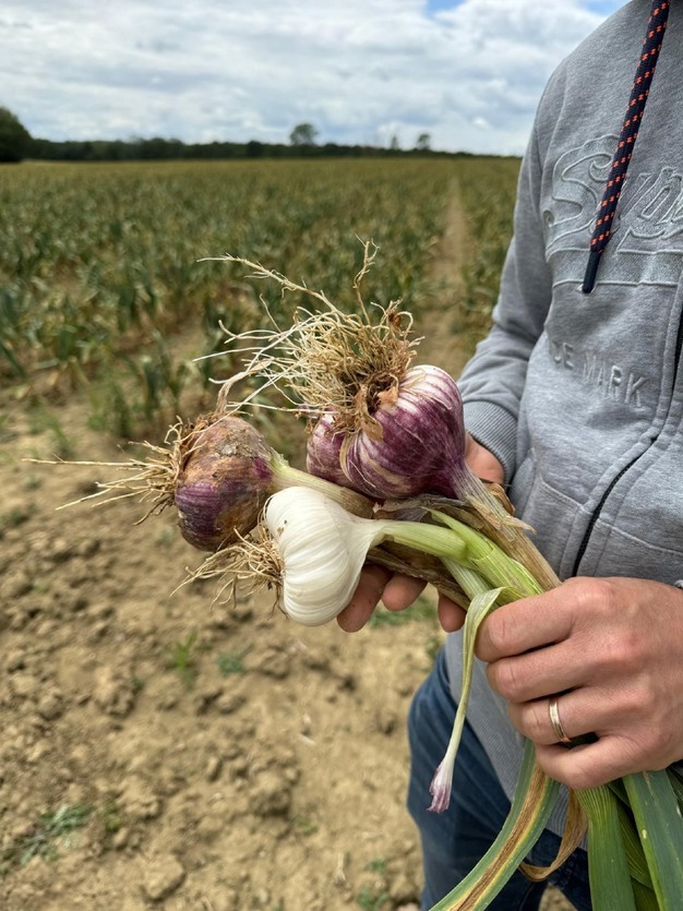 De las 50-60 ha cultivadas, Laurent Heinis explica que 30 ha están plantadas con ajo rosa de Billom, que es un ajo rosa de primavera (en proceso de reconocimiento como IGP). Se trata del mismo ajo (pero no ahumado) que el ajo ahumado de Arleux, que se planta más tarde que la mayoría de los ajos de otoño producidos en Francia. La cosecha se efectúa más tarde, después del 14 de julio. Este año, la ola de calor de finales de junio ha influido mucho en la cosecha, que es, por tanto muy modesta, con una mayoría de calibres pequeños, entre 40 y 60. En el plano sanitario, sin embargo, la situación es positiva, con muy poco Fusarium o podredumbre. El resto de la superficie cultivada se destina principalmente a la producción de ajos de otoño, destinados al mercado temprano de productos frescos, pero sobre todo a la transformación, ya que el departamento del Puy de Dôme alberga una de las mayores deshidratadoras de ajos de Europa.