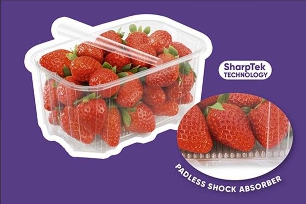 Sharptek, por ejemplo, es la nueva bandeja patentada para frutas delicadas: con ella se puede prescindir de materiales protectores como el plástico de burbujas, reduce el peso total hasta un 17% y, gracias a su monomaterial reciclable, combina protección y ligereza respetando la sostenibilidad.