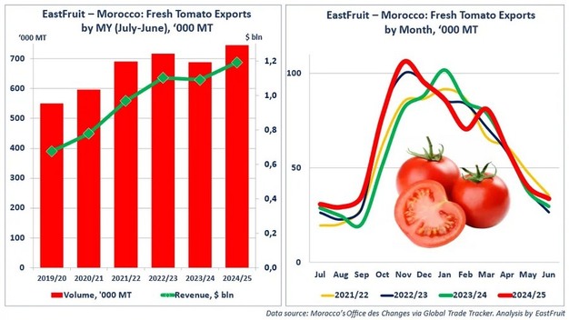 Marruecos ha establecido un nuevo récord estacional para las exportaciones de tomate, alcanzando las 745.000 toneladas durante la temporada 2024/25 (julio-junio), según datos de la Oficina de Cambios vía Global Trade Tracker analizados por EastFruit. Los ingresos por exportación ascendieron a casi 1.200 millones de dólares, un 8,3% más que en la temporada anterior y superando el récord de 2022/23 en casi un 4%.