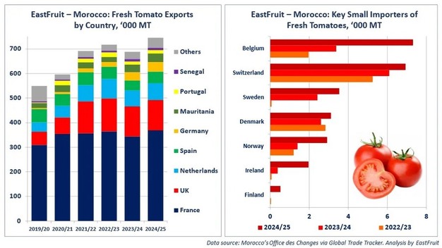 Los tomates siguen siendo la principal exportación hortofrutícola del país, representando más del 30% de los ingresos en divisas del sector. Marruecos es actualmente el tercer exportador mundial de tomates, después de México y los Países Bajos. Los volúmenes de exportación se distribuyen a lo largo de todo el año, con un pico de envíos entre noviembre y marzo. En noviembre de 2024, Marruecos registró su mayor envío mensual hasta la fecha, con 105.000 toneladas.