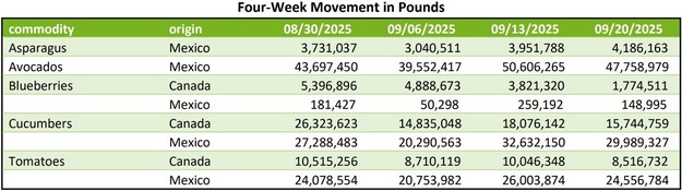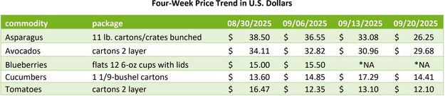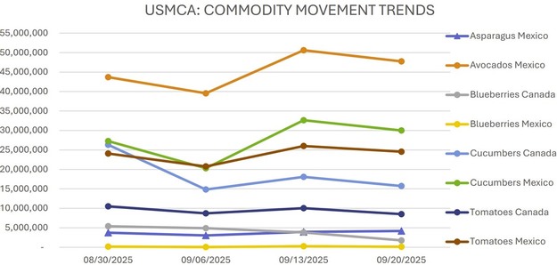 El flujo comercial de espárrago, aguacate, arándano, pepino y tomate continúa atravesando los principales puntos de entrada en Estados Unidos, aunque con tendencias dispares tanto en volúmenes como en precios. En general, el mercado se mueve con un ritmo entre lento y moderado, y se observan bajadas de precios en varias categorías clave del sector.