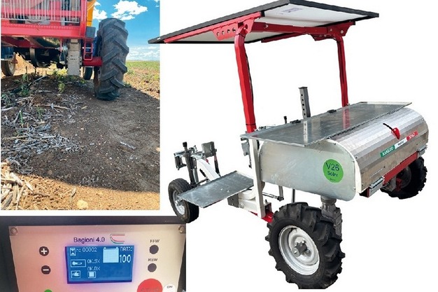 Ante esta situación, la empresa Bagioni Technology, con sede en Forlì, ha decidido proponer una innovación que hace que la cosechadora sea totalmente versátil. "Tenemos clientes en todo el mundo con necesidades diferentes", explica su propietario, Aurenzo Bagioni. "Así que hemos querido ofrecer una solución definitiva. Con nuestra máquina V26 Solar ofrecemos una máquina adecuada a todas las necesidades. Por ejemplo, podemos ajustar su distancia al suelo y su anchura. Dispone de tres configuraciones diferentes de sistemas de dirección, adaptados según las necesidades más frecuentes".