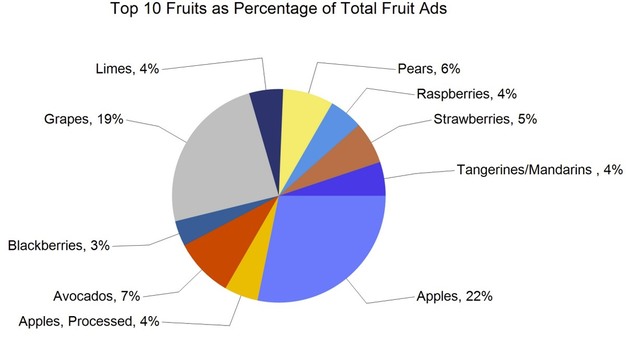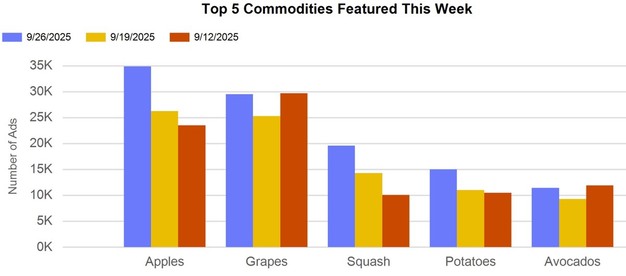 Las variaciones de precios de los principales artículos anunciados (3.000 o más anuncios) en comparación con la misma semana del año anterior incluyen un aumento del 12% para las manzanas Honeycrisp (por libra) y del 10% para las manzanas Gala (bolsa de 3 libras). Las peras Bartlett (por libra) han bajado un 18% y los aguacates (cada uno) un 13%. Las patatas y las cebollas no han registrado cambios significativos de precio en la semana 39. En el caso de las hortalizas, no ha habido aumentos notables, pero las calabazas han bajado un 11%.