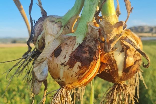 Según explica el empresario, los precios EXW (en fábrica) se han mantenido en torno a los 0,40 €/kg desde mediados de julio hasta la primera semana de septiembre. "Nunca antes habíamos visto una tendencia de precios como esta, y, siendo sincero, no nos lo esperábamos, especialmente teniendo en cuenta que los rendimientos por hectárea en la región de Tebas están siendo altísimos: entre 50 y 60 toneladas por hectárea, incluso en esta campaña de verano tardía. Las pocas explotaciones con menor producción no bajan de las 40 toneladas. Además, estamos recolectando cebollas de todos los calibres", apunta.