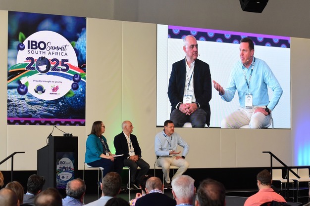 © Carolize Jansen | FreshPlaza.es Antoinette van Heerden, del Fresh Produce Exporters' Forum; Rugelio Busto Duarte, de Hapag-Lloyd, y Schalk Bruwer, de Morgan Cargo, conversan en la cumbre IBO Summit 2025 de Ciudad del Cabo.