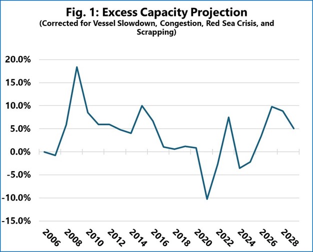 Un análisis reciente de la industria mundial del transporte marítimo de contenedores sugiere que el mercado se está desplazando estructuralmente hacia una nueva fase de exceso de capacidad cíclica, que se espera que alcance su punto máximo en 2027 a niveles vistos por última vez durante las guerras de precios del transporte marítimo de contenedores de 2016.