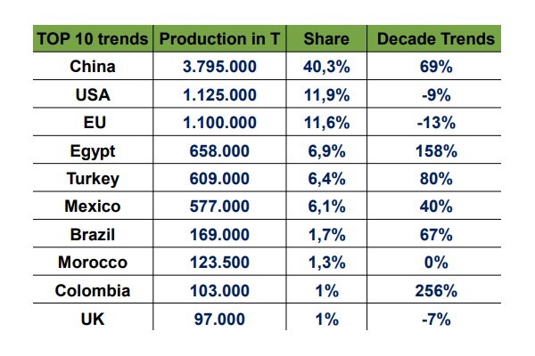 Philippe abordó en primer lugar las tendencias actuales. "El sector de la fresa y las hortalizas europeas sigue teniendo una orientación muy local y estacional; de hecho, más de la mitad de la producción permanece en su país de origen. Pero también hay mucho comercio recíproco dentro y fuera de la UE, con importaciones y exportaciones que se complementan en función de las distintas temporadas. A escala mundial, China es el mayor productor (40 %), seguido de EE.UU. (11,9 %) y la UE (11,6 %). Nuevos actores como Egipto, Turquía y México están creciendo rápidamente". Philippe ve una tendencia a la baja de la producción en los países occidentales debido a cambios de las condiciones climáticas y del cultivo, así como de los costes laborales y energéticos.