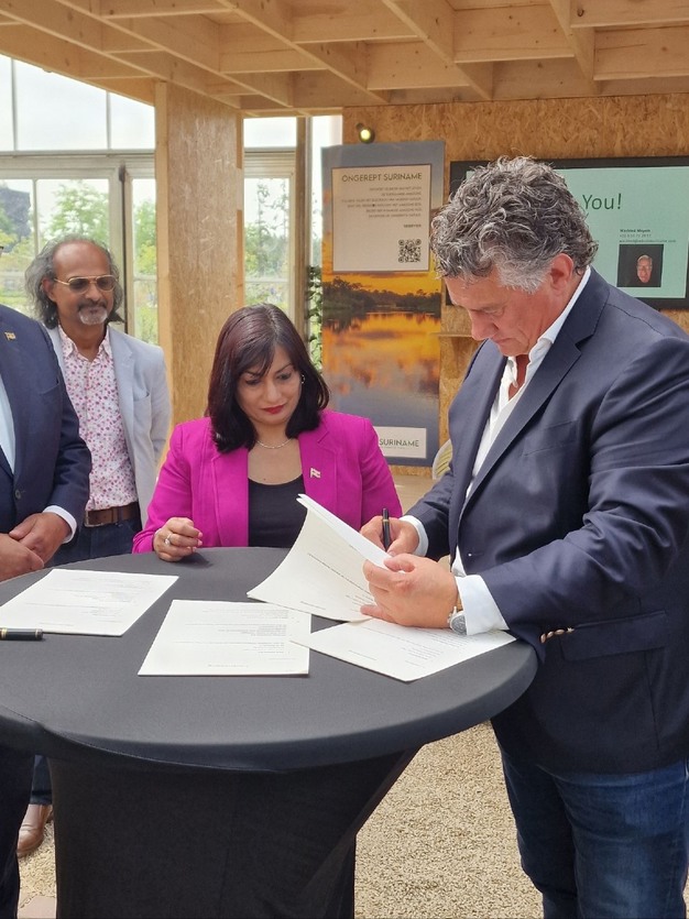 Kees Rijnhout y Rishma Kuldipsingh, la exministra de Economía, firmaron el documento LOI en la feria Floriade en 2022.