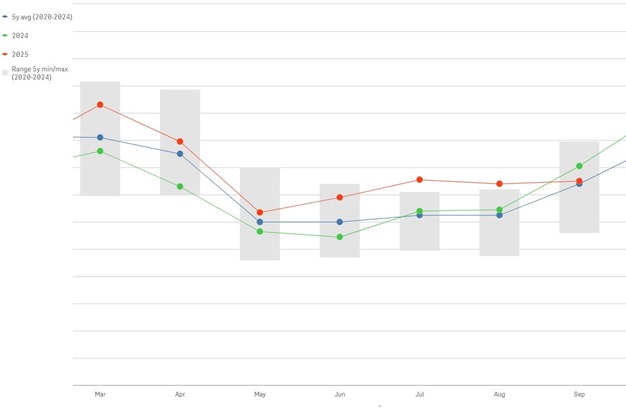 En términos generales, el precio medio por kilo de tomate en la Unión Europea fue de 1,50 euros, alineándose con la media quinquenal. A diferencia de años anteriores, cuando septiembre solía ir acompañado de repuntes en las cotizaciones, este año los precios han seguido una dinámica descendente, rompiendo así con la tendencia habitual del mercado europeo.