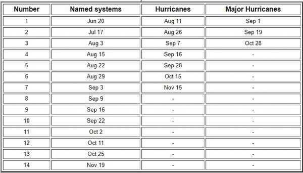 La siguiente tabla muestra el desarrollo medio de la temporada de huracanes en el Atlántico en 30 años.