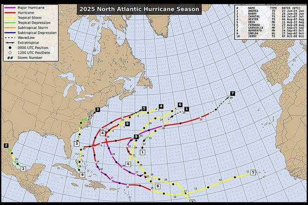 "Lo normal sería que a 16 de septiembre hubiera nueve tormentas con nombre", afirma Drew Lerner, de World Weather, Inc. "Vamos con un poco de retraso, ya que este año hubo que esperar hasta el 1 de octubre para registrar nueve tormentas con nombre". Con la reciente evolución de la tormenta tropical Jerry, en relación con la norma del 11 de octubre tenemos unas dos tormentas menos de lo normal. Los dos grandes huracanes registrados este año también se acercan a la norma". Sin embargo, la norma se basa en una media de 30 años, mientras que en los últimos años ha aumentado el número de tormentas activas. Mientras que la antigua norma era de 10 a 12 tormentas en la temporada estival, en los últimos años el número se ha ampliado a 14. Por este motivo, el número parece ser mucho menor este año en comparación con los últimos.