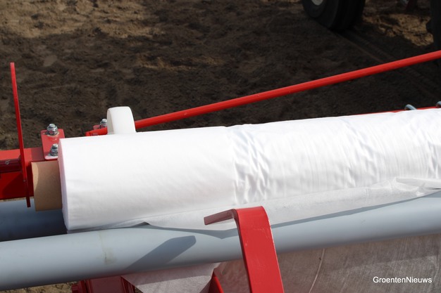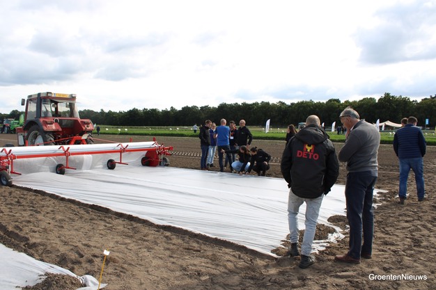 En otro lugar del campo de demostración había otro tractor con un sistema de Deto Mechanisatie pensado para la colocación de lonas protectoras sobre los cultivos. Estos materiales pueden utilizarse para proteger los cultivos y para permitir adelantar la producción o alargar los periodos de cultivo.