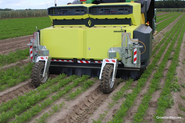La tercera máquina que pudieron admirar los visitantes de "Top of the Crops" fue una de Escarda, que lanzó el producto oficialmente esta primavera. Los representantes de Homburg, el distribuidor, demostraron cómo la máquina utiliza energía térmica para controlar las malas hierbas. La máquina dispara un rayo láser al núcleo de la mala hierba, provocando su muerte. Para distinguir las malas hierbas de los cultivos se utiliza tecnología de visión avanzada.