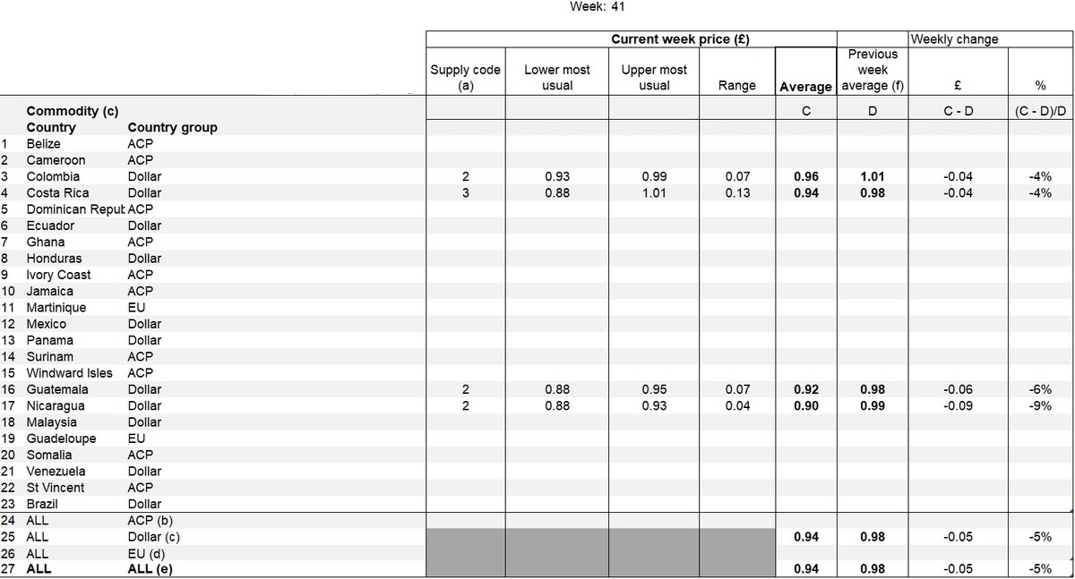 Los precios medios de la banana bajaron en varios de los principales proveedores latinoamericanos en la semana 41 en comparación con la semana anterior, según los datos oficiales del mercado.
