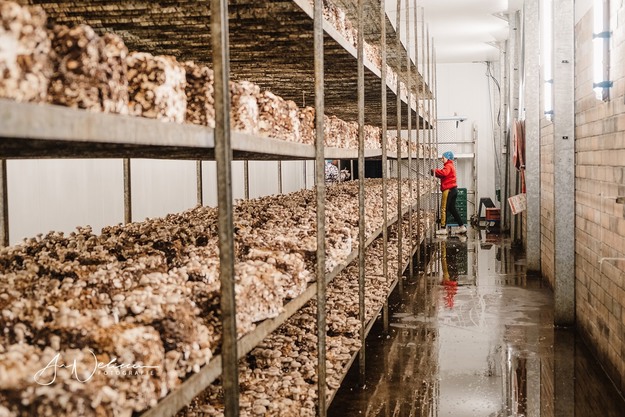 La transición al producto ecológico comenzó hace más de una década. Es algo que se hizo para dejar atrás la presión de los precios convencionales. La gama se introdujo bajo la marca de calidad Tomabel, lo que aceleró aún más el crecimiento. El surtido, que al principio consistía en setas chestnut y setas de ostra, pasó a incluir también shiitake, nameko y shimeji, entre otros. "Hoy somos el mayor proveedor belga de setas ecológicas. Eso solo es posible gracias a nuestro modelo cooperativo, con productores relativamente pequeños que se hacen fuertes uniendo sus fuerzas", defiende Pieter.
