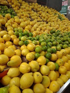 Derecha: un ramillete de limas sobre una montaña de limones en una sucursal del retailer Food Lover's Market.