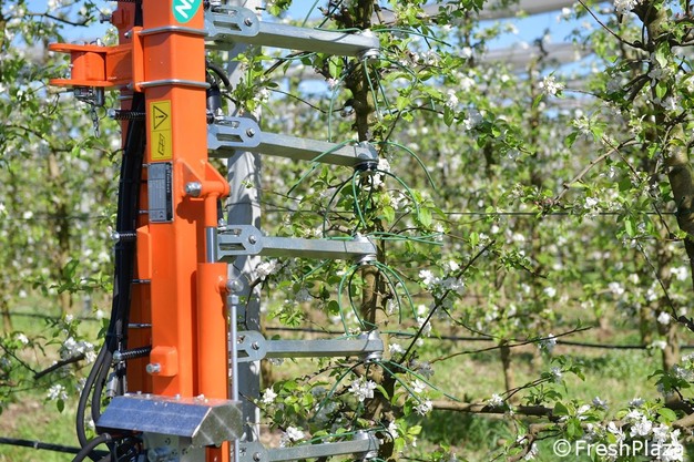 "En comparación con otras soluciones del mercado las máquinas Florix ofrecen sobre todo un mejor contorno con respecto al follaje que se va a aclarar, empezando por los brazos independientes, equipados con muelles, que permiten que cada unidad se adapte a la forma y dirección de las ramas. Además, mediante un joystick, se pueden gestionar por separado las velocidades de rotación de las unidades de aclareo superior e inferior, gracias a dos circuitos electrohidráulicos independientes que consiguen diferentes intensidades de aclareo. Se trata de una práctica recomendada, también teniendo en cuenta los diferentes efectos de las heladas en función del desarrollo vertical de las plantas", prosigue Bresciani.