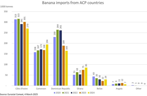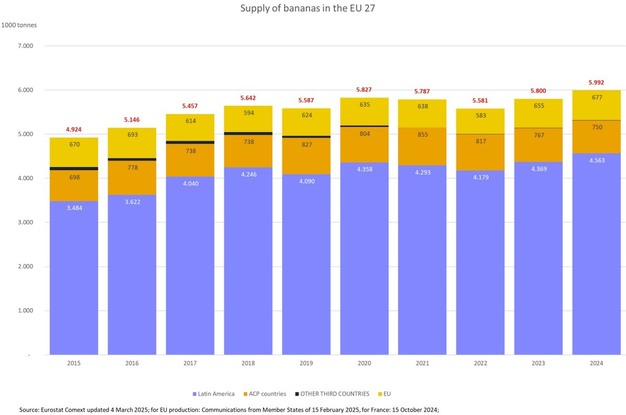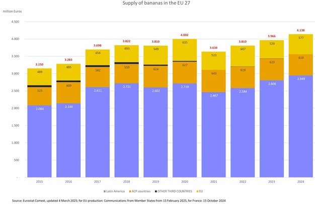Según el informe de la Comisión Europea Bananas Market Situation – October 2025, se prevé que la producción total de bananas de la UE en 2025 será de 543.806 toneladas, de las cuales 60.911 se comercializarán dentro de las regiones productoras y 482.896 fuera de ellas. El precio medio de las bananas vendidas localmente fue de 1,12 euros/kg, mientras que las comercializadas fuera de las regiones productoras alcanzaron una media de 1,14 euros/kg.