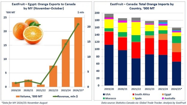Entre noviembre de 2024 y agosto de 2025, los exportadores egipcios enviaron más de 25.000 toneladas de naranjas a Canadá, con las que generaron más de 20 millones de dólares en ingresos. Esto representa un aumento del 50% respecto a la temporada anterior y más del triple del volumen exportado en 2022/23. En las últimas tres temporadas, las exportaciones de naranjas de Egipto a Canadá se han multiplicado casi por treinta.