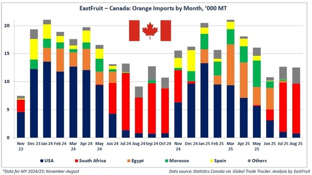 El mercado canadiense de naranjas se abastece principalmente de Estados Unidos y Sudáfrica, que juntos representan el 60-70% de las importaciones totales. Las naranjas estadounidenses dominan el mercado de diciembre a mayo, mientras que la fruta sudafricana lidera de julio a octubre.