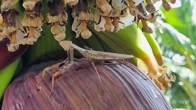 © Johan van der WaalsMantis en una flor de banana en Canterbury Estates, Esuatini.