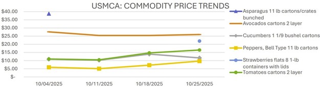 Las importaciones de Perú a través del sur de California están disminuyendo, con un comercio moderado y precios más bajos. Las cajas de espárragos verdes de 11 libras cuestan en su mayoría US$40.75-42.75 para los jumbo y extra grandes, US$34.00-36.75 para los grandes, US$30.00-32.00 para los estándar, y US$28.00-30.00 para los pequeños; los blancos grandes cuestan US$42.00-44.00. Los envíos desde México a través de Arizona, California y Texas también están disminuyendo ligeramente, y la mayoría ya están reservados.