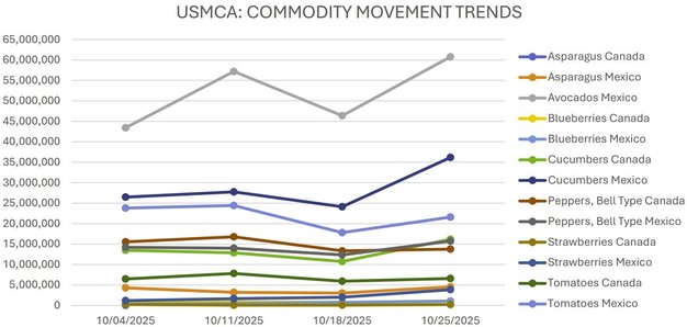 Las importaciones de Perú vía Miami, Filadelfia y Nueva York están aumentando a medida que avanza la temporada, con un comercio activo y buena calidad. Los envíos mexicanos y chilenos también están aumentando, aunque los volúmenes actuales son limitados y los mercados aún no están establecidos. Los primeros informes F.O.B. de Chile se esperan para finales de octubre.