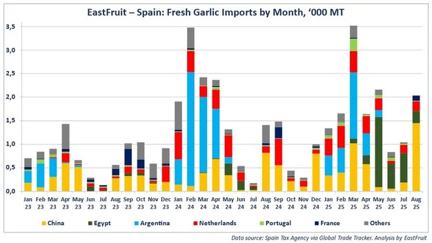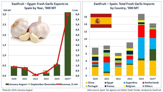 Según los analistas de EastFruit, España, el mayor productor y exportador de ajo de Europa, importó más de 3.000 toneladas de ajo egipcio entre enero y agosto de 2025, valoradas en casi 6 millones de dólares. Esto representa un aumento de cinco veces en comparación con el mismo período del año pasado y supera las exportaciones acumuladas de ajo de Egipto a España durante la última década en aproximadamente un 50%.