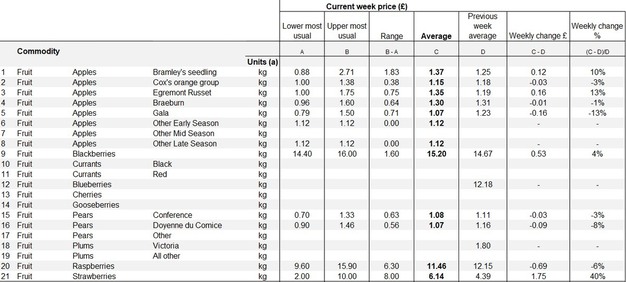 Los mercados británicos de manzanas y berries han registrado en la semana 45 movimientos de precios opuestos, según los últimos datos del Defra (Departamento de Medio Ambiente, Alimentación y Asuntos Rurales) sobre la venta al por mayor. Entre las principales variedades de manzana, Bramley's Seedling subió un 10%, hasta 1,37 libras por kilogramo, frente a las 1,25 de la semana anterior. Egremont Russet también aumentó un 13%, hasta 1,35 libras por kilo, mientras que el grupo Cox's Orange bajó un 3%, hasta 1,15 libras por kilo. Los precios de la Braeburn bajaron ligeramente a 1,30 libras, mientras que la Gala experimentó la caída más pronunciada entre las principales variedades, con un descenso del 13% a 1,07 libras por kilogramo.