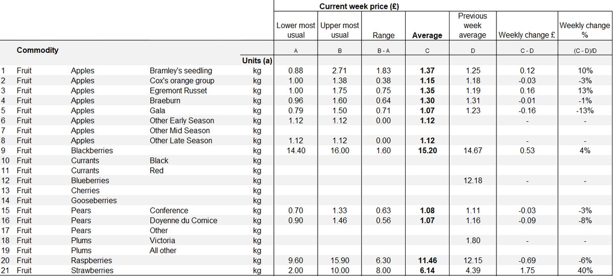 Entre las berries, las moras alcanzaron una media de 15,20 libras por kilogramo, un 4% más que los 14,67 libras de la semana anterior. Las frambuesas, sin embargo, bajaron un 6%, hasta 11,46 libras por kilo, mientras que las fresas registraron una subida del 40%, hasta 6,14 libras por kilo. Los precios de los arándanos se situaron en 12,18 libras por kilogramo, aunque sin cambios respecto a la semana pasada debido a las escasas actualizaciones.