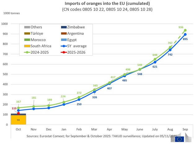 Las importaciones de naranja en la UE alcanzaron las 113.146 toneladas en octubre de 2025, frente a las 166.825 toneladas de octubre de 2024. Esto marca un comienzo más lento de la temporada, ya que los volúmenes de 2024-2025 ya habían superado la media de cinco años en el mismo punto. Sudáfrica siguió siendo el principal proveedor, con contribuciones menores de Egipto, Marruecos, Argentina y Turquía.