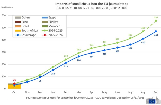 Las importaciones de cítricos pequeños ascendieron a 42.651 toneladas en octubre de 2025, frente a las 43.453 toneladas de octubre de 2024. La categoría, que incluye mandarinas, clementinas y frutas similares, abrió ligeramente por encima de la media quinquenal. Sudáfrica volvió a representar la mayor parte de los envíos de principios de temporada, seguida de Marruecos, Turquía e Israel.
