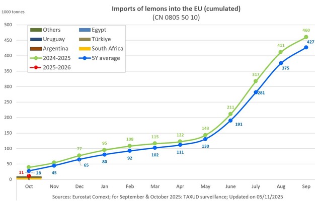 Las importaciones de limones de la UE se registraron en 11.130 toneladas en octubre de 2025, frente a las 38.727 toneladas de octubre de 2024. Esto representa un inicio notablemente inferior tanto a la temporada anterior como a la media quinquenal de 45.000 toneladas para el mismo periodo. Los principales proveedores fueron Turquía, Argentina, Sudáfrica y Egipto.