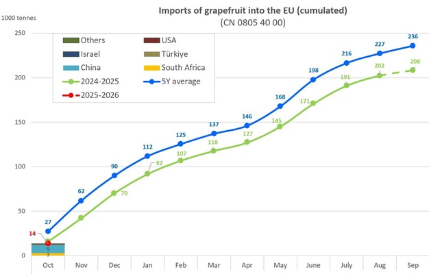 Las importaciones de pomelo alcanzaron las 13.507 toneladas en octubre de 2025, frente a las 15.978 toneladas de octubre de 2024. La oferta de principios de temporada fue inferior a la media quinquenal de 27.236 toneladas, con Sudáfrica, Turquía, China y Estados Unidos como principales fuentes. En general, los datos de importación temprana de cítricos sugieren una entrada más lenta en el mercado europeo en comparación con 2024, en particular para naranjas, limones y pomelos.